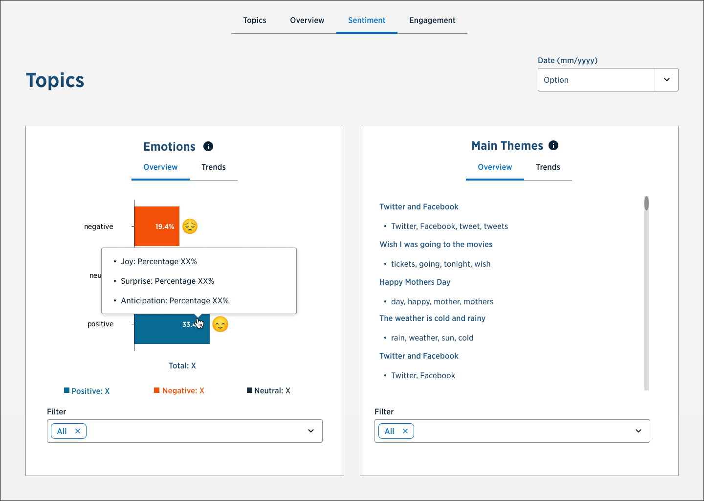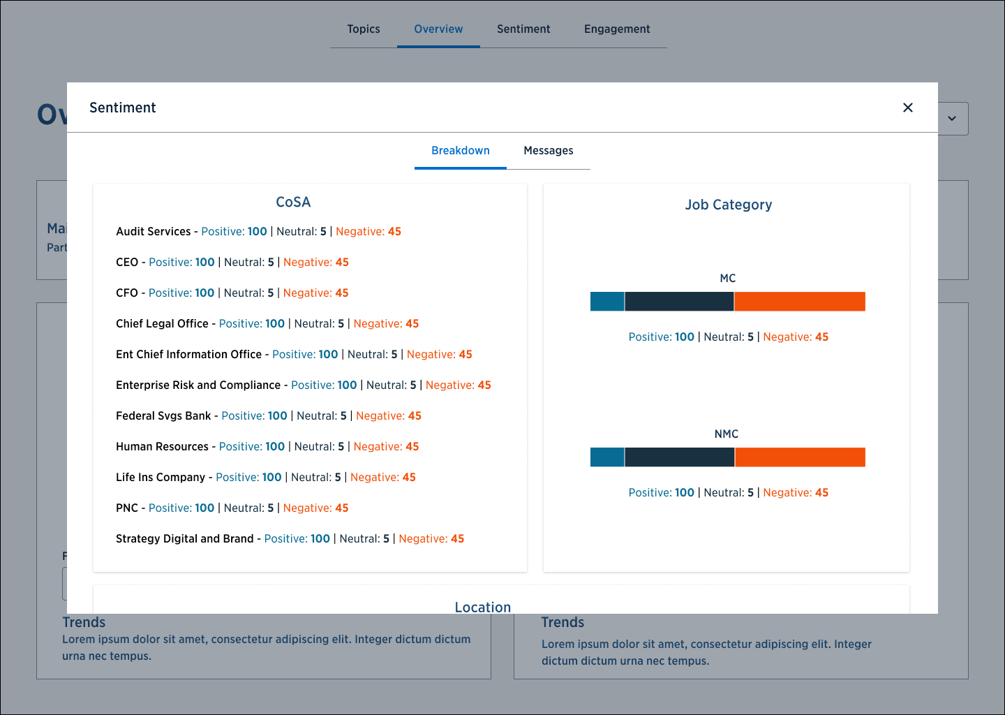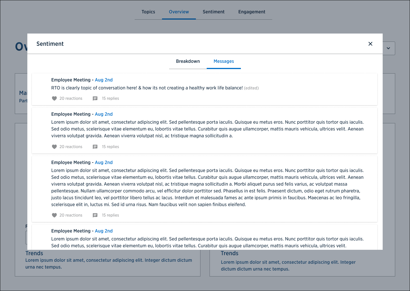 AI powered sentiment dashboard created for my company to scroll through a designated Slack Channel and report various collective sentiment that would otherwise be difficult for one person to go through manually. This sentiment was parsed into themes, given positive or negative indicators, and otherwise find specific topics so management could better understand employee needs and address them faster.